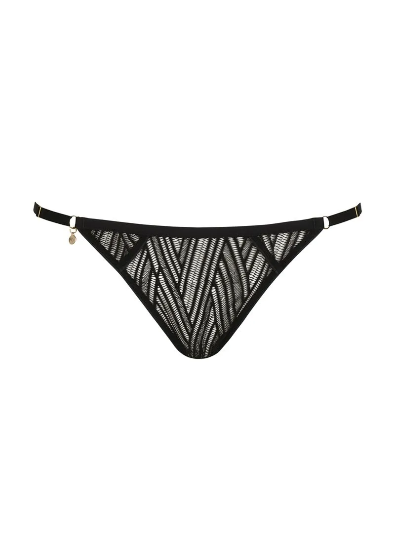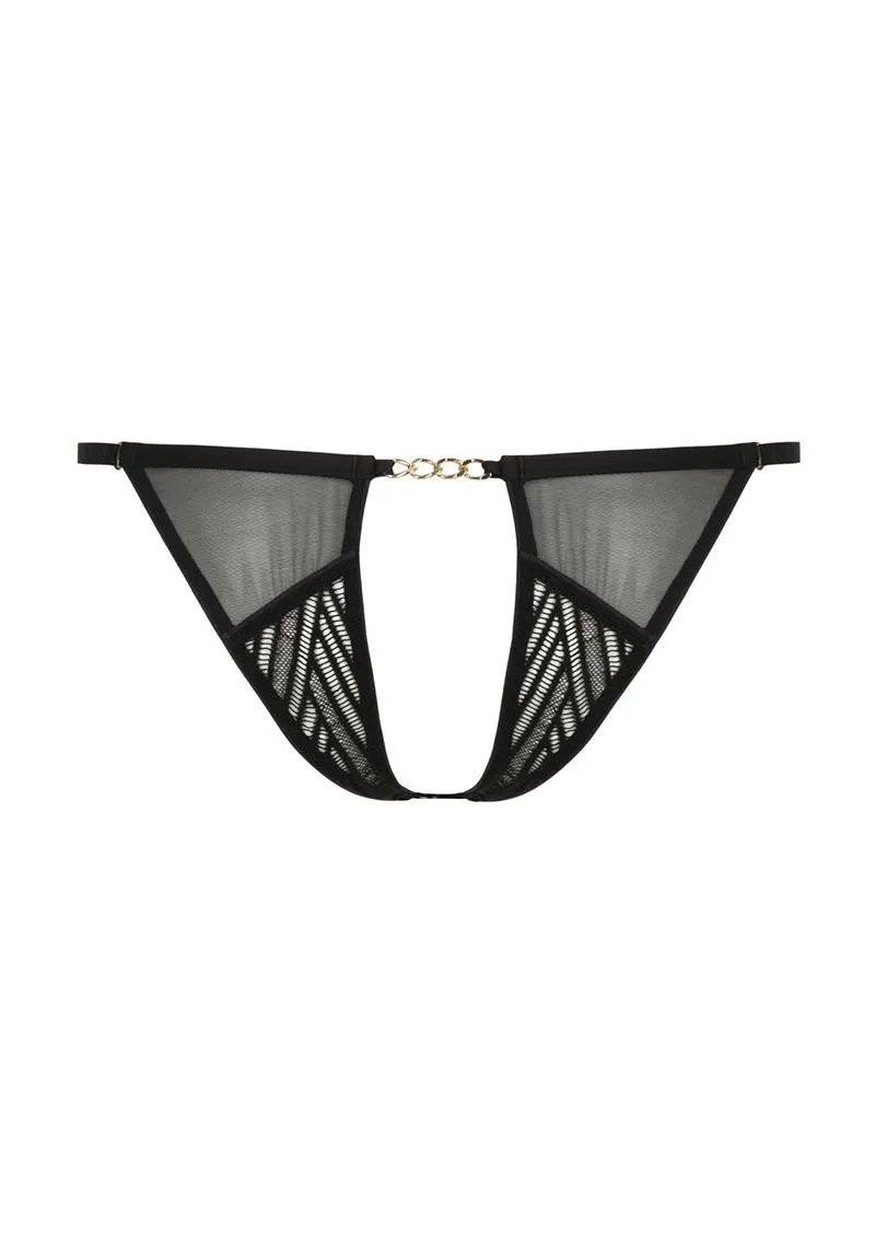Cette culotte est composée d’une dentelle transparente qui dessine sur le corps un motif graphique. Ses attaches dorées contrastent avec sa couleur noire et lui confère un effet bijou. Une chaîne en acier dorée habille le creux de reins et appuie l’effet délicieusement provocant de cette culotte ouverte.