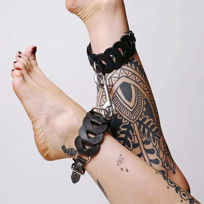 Ces chevillères en cuir tressé sont reliées entre elles par un mousqueton en acier amovible mais il est possible d’utiliser un autre accessoire comme par exemple une corde ou un lien en soie. Pour encore plus de possibilités, on peut compléter la parure avec les menottes et le choker assortis. Une collection d’accessoires BDSM à disposition pour se constituer un véritable kit de contrainte. Pourquoi ne pas relier les chevillières aux menottes en les attachant ensemble dans le dos ou à l’avant du corps par exemple pour varier les plaisirs ? Les idées ne manquent pas, osez explorer vos fantasmes.