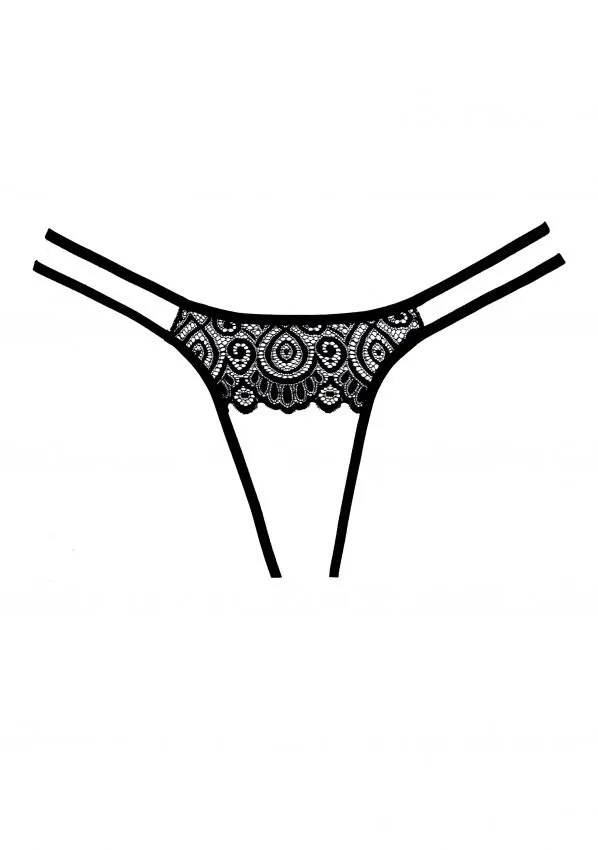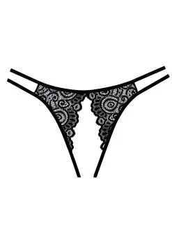 Faite d’un jeu de lanière, une jolie dentelle habille l’avant et le haut des fesses.