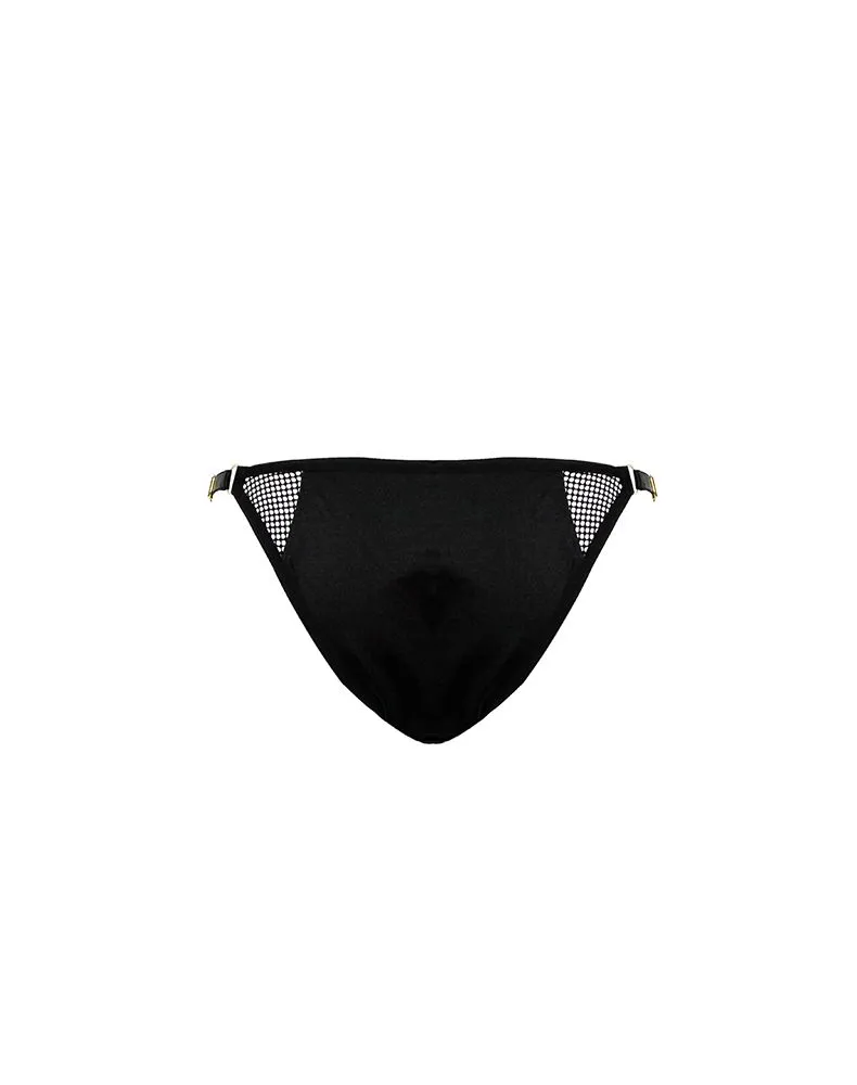 Deux lanières fines marquent les hanches et se règlent grâce à des attaches plaquées or 24 carats.