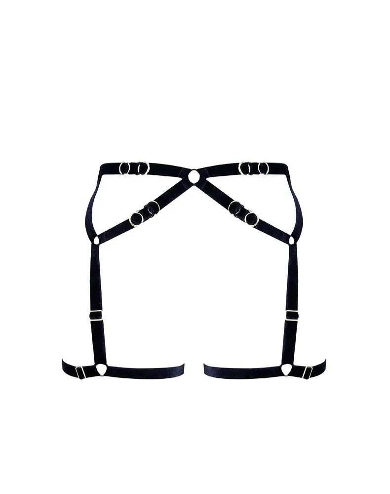 Ce harnais en velours reprend la forme d’un porte-jarretelles.