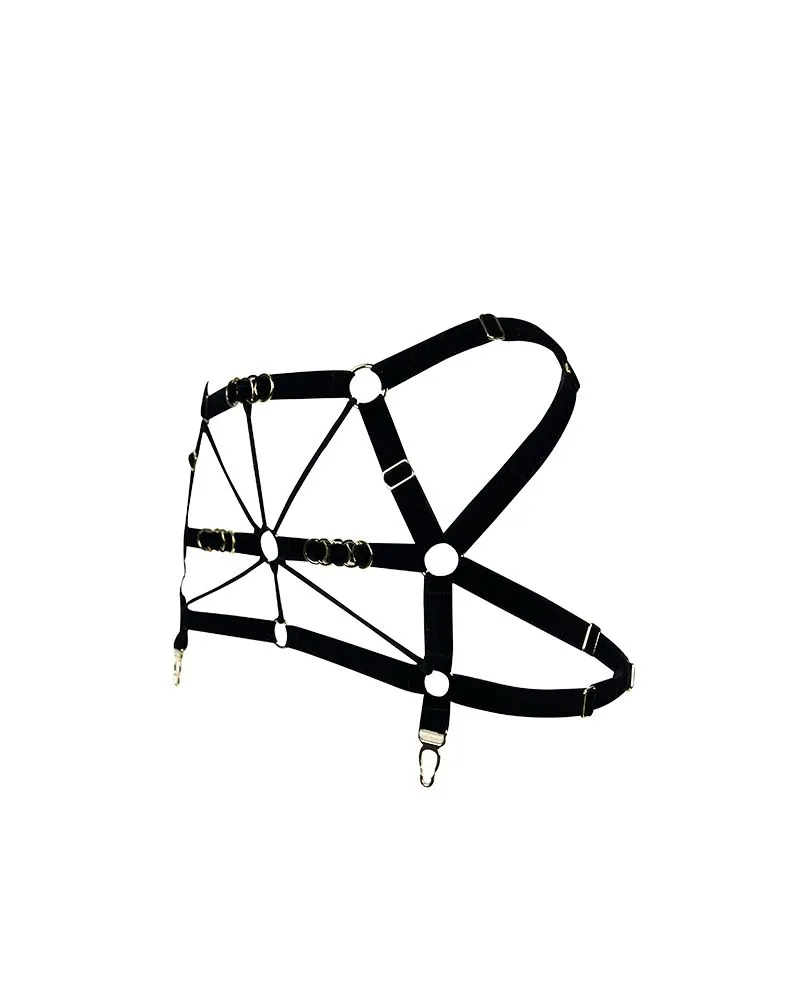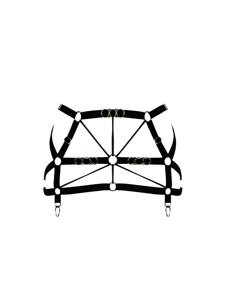 Tout en lanières, cette jupe porte-jarretelles se porte autant comme culotte ouverte que comme accessoire pour sublimer une parure de lingerie. Elle peut ainsi se porter sur un string ou un body pour un effet harnais. Ses porte-jarretelles permettent d’accrocher une paire de bas ou des jarretières. Mettez son jeu de lanières en lumière en le dévoilant sous une robe transparente. Et pour une parure complète, portez votre jupe avec le soutien-gorge Cage de la même collection. Son ouverture invite à la sensualité… Succombez aux effluves d’une brume intime ou laissez-vous tenter par la beauté d’un rosebud.