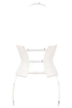 Cette pièce de lingerie d’exception se compose d’une dentelle ivoire au motif floral et dont la finesse ressort par effet de transparence avec la peau. Sur les côtés, un empiècement en lycra vient affiner la taille. Seins nus, elle peut se porter avec un soutien-gorge ou une paire de nippies pour sublimer la poitrine. Au dos du modèle 3 bretelles réglables en largeur indépendamment les unes des autres. permettent de l’ajuster parfaitement aux courbes. À elles, s’ajoute une large bretelle de maintien qui passe derrière le cou. Celle-ci est amovible et permet de porter votre guêpière sans bretelles, à l’instar d’un large serre-taille.