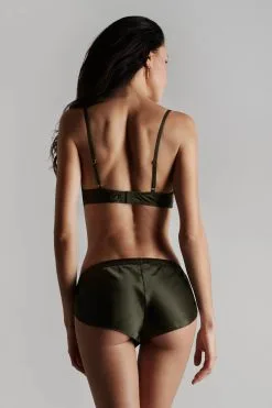 Taille basse, ce mini short habille les hanches et les fesses d’une soie fine. Deux fentes arrondies de chaque côté subliment la silhouette. Sa ceinture élastique est recouverte de soie froncée, elle assure son maintien tout en confort. Sa coupe échancrée sur le dos souligne le galbe naturel de la fesse.