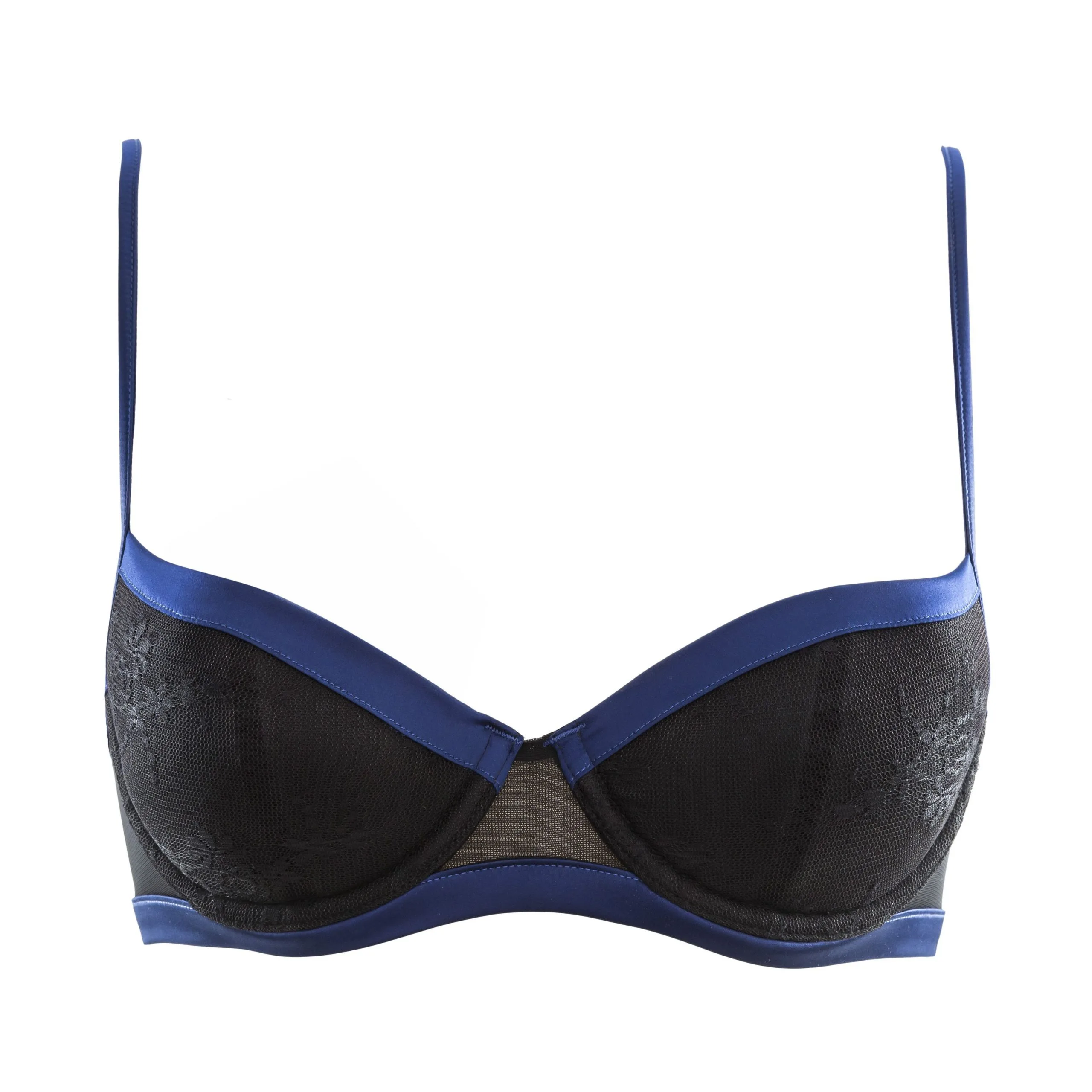 Contraste subtil entre le noir de la dentelle et du tulle et le bleu marine du satin mat pour cette collection tout en subtilité.