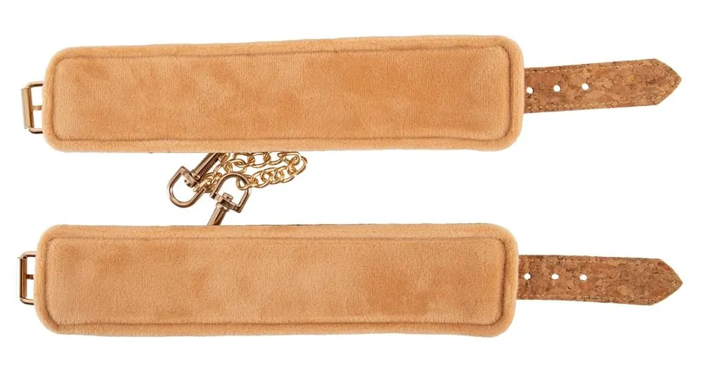 Bi-matière, ces menottes habillent le poignet d’un bracelet en liège dont l’intérieur est fourré d’une douce peluche. Réglables en largeur, elles s’adaptent à toutes les tailles de mains. Leurs attaches sont en acier doré, leur donnant un élégant effet bijou. Celle-ci est détachable, vous permettant de varier les jeux et les scénarios.