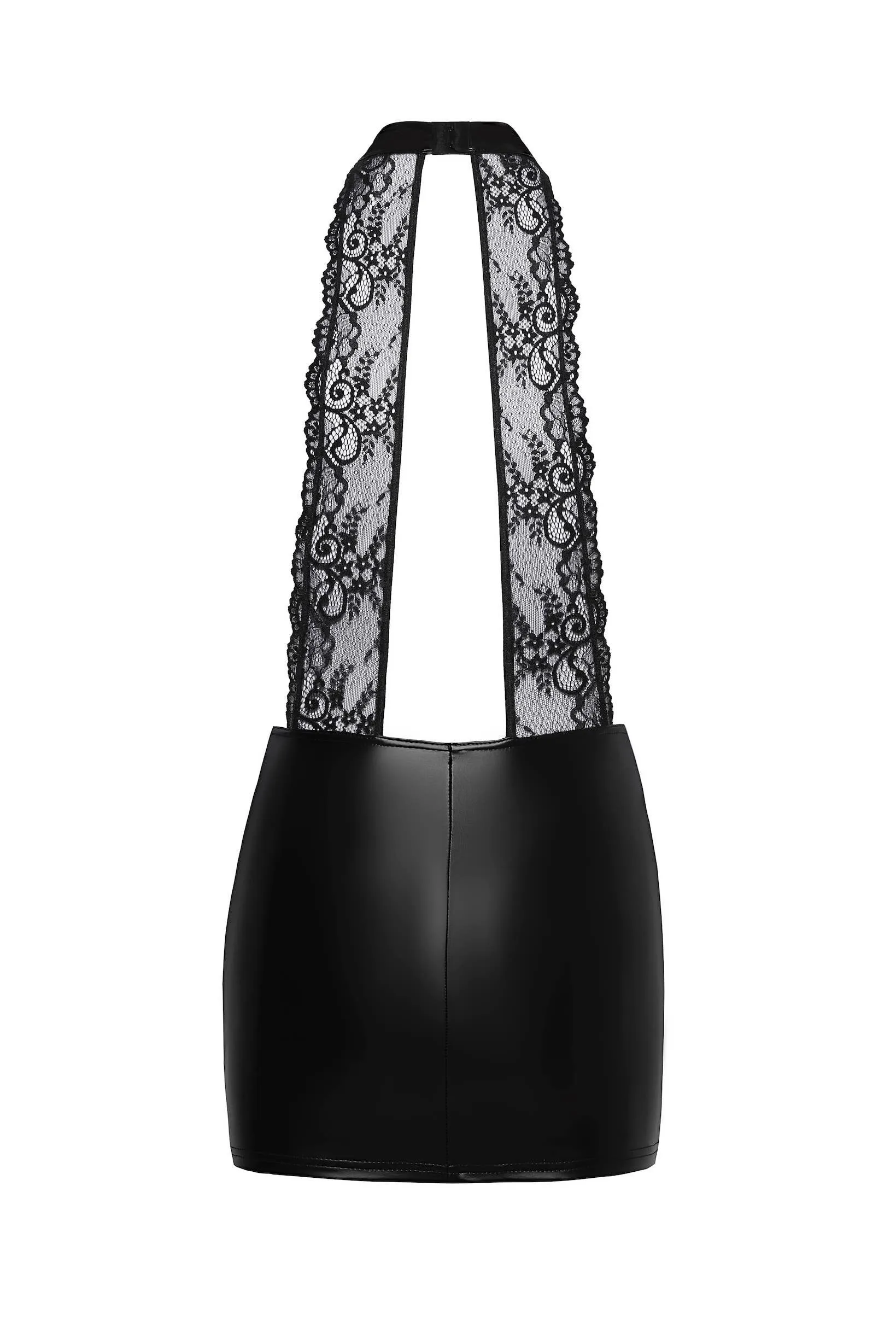 Cette robe se compose d’une jupe en wetlook et d’un décolleté à l’effet drapé en dentelle transparente. Courte et moulante, elle met en valeur les fesses. La poitrine est soulignée par la dentelle fine. Son col montant accentue l’effet plongeant et invite le regard sur l’entre-seins. Son dos est également laissé semi-nu, sa dentelle tombant jusqu’au creux des reins.