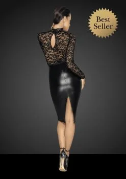 Composée d’une jupe longue en wetlook et d’un haut manches longues en dentelle noire, cette robe habille le corps tout en douceur. Son col montant sublime le cou. Sa jupe longue est fendue sur le bas, apportant un détail raffiné tout en rendant les mouvements plus fluide. La poitrine est dévoilée sous un motif fleuri et la taille marquée par la double matière.Â