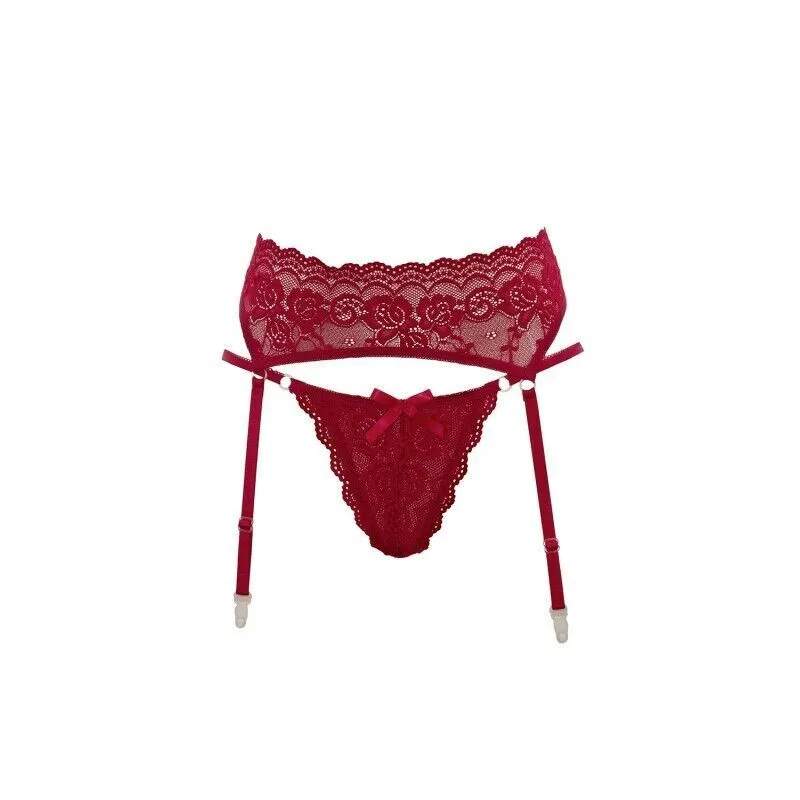 Ce porte-jarretelles est en dentelle fine qui dessine un motif floral sur les hanches. On le portera en parure avec un ensemble de lingerie en dentelle ou un harnais de poitrine et une paire de nippies. Ses attaches permettent de le porter avec tous les bas en voile.Â