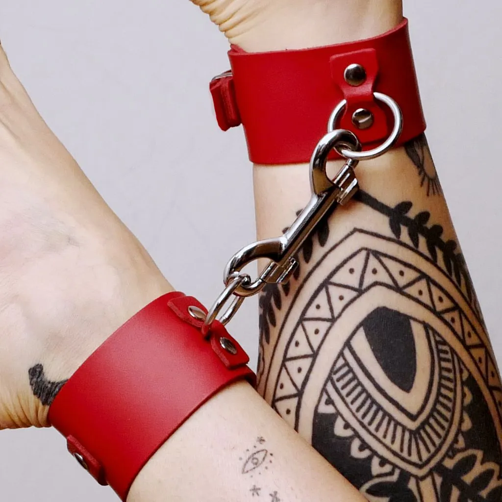 Ces chevillères en cuir rouge sont reliées entre elles par un mousqueton en acier amovible. Il peut facilement être remplacé par un autre accessoire comme une corde en chanvre ou en coton, un lien en soie ou une laisse pour laisser libre cours aux jeux de soumission. Créez votre kit complet en l’associant au choker et aux menottes de la même collection. Et cela ne s’arrête pas là! Les possibilités sont infinies et pour varier les jeux de soumission, d’autres accessoires sont à disposition comme une ceinture de cuisses, des anneaux de suspension, des bougies à basses températures, etc. La voie du plaisir est infinie !