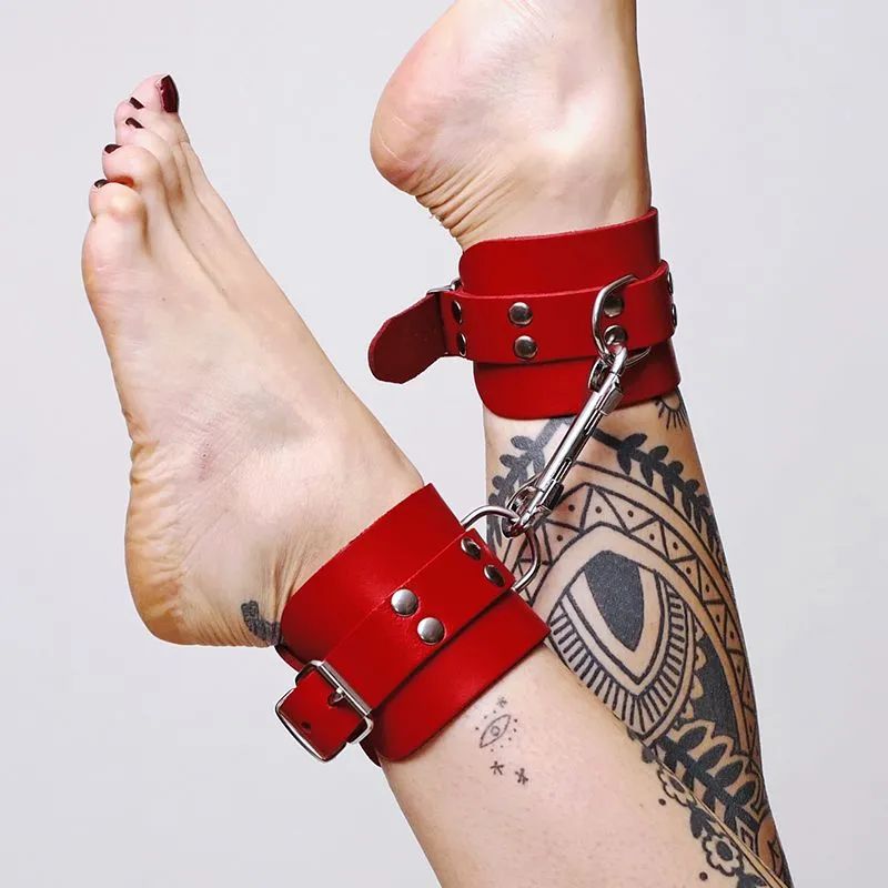 Les chevillères en cuir épais rouge ont une coupe large qui permet d’enserrer fermement la cheville pour un abandon total lors des jeux de soumission. Réglables et unisexes, ces chevillères s’adaptent à tous les tours de cheville. Le cuir rouge est épais et doux à l’intérieur ce qui permet de contraindre avec fermeté sans blesser la peau. Un anneau d’attache en acier argenté orne l’avant. Les chevillères sont reliés entre elles par un mousqueton en acier amovible qui peut être remplacé par d’autres accessoires BDSM.